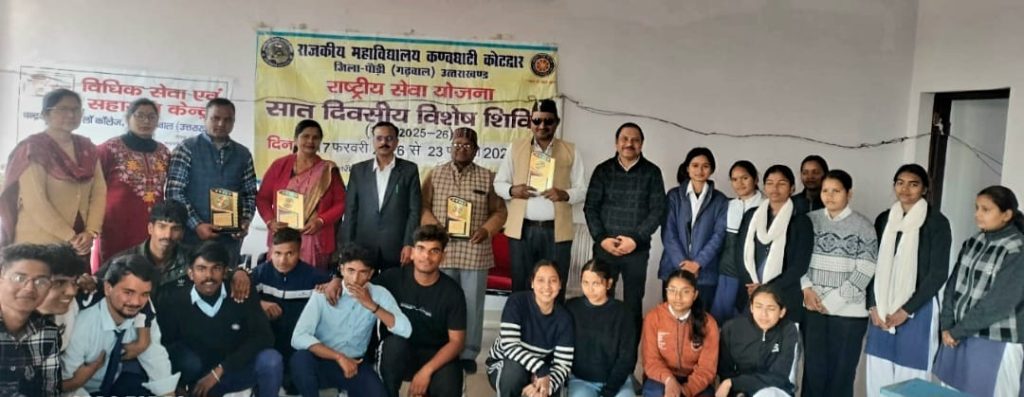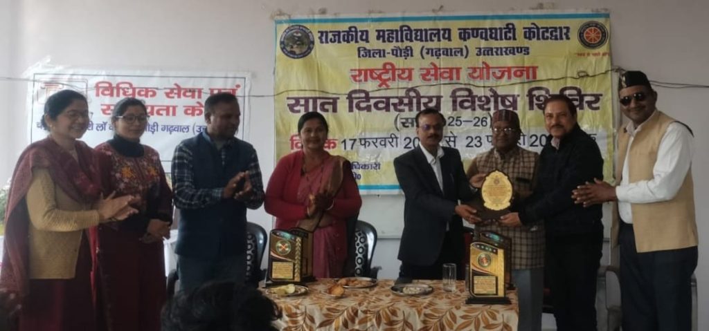 राजकीय महाविद्यालय कण्वघाटी कोटद्वार की राष्ट्रीय सेवा योजना इकाई के सात दिवसीय विशेष शिविर का आयोजन। राजकीय महाविद्यालय कण्वघाटी कोटद्वार के अंतर्गत राष्ट्रीय सेवा योजना इकाई के तत्वाधान में 7 दिवसीय विशेष शिविर का प्रारंभ किया गया। यह शिविर 17 फरवरी से 23 फ़रवरी तक चंद्रावती लॉ कॉलेज कोटद्वार में आयोजित किया गया है। उद्घाटन सत्र में मुख्य अतिथि प्रमुख समाजसेवी एवं सर्वोदय पुरुष डॉ. सुरेंद्र लाल आर्य जी रहे उन्होंने सेवा को जीवन का आधार बताया तथा सभी से सेवा के मार्ग को अपनाने के लिए कहा । विशिष्ट अतिथि डॉ. अनुराधा कौशल्या प्राचार्या चंद्रावती लॉ कॉलेज कोटद्वार रही उन्होंने सभी से समाज में योगदान देकर अच्छे समाज का निर्माण करने का विचार दिया । महाविद्यालय के प्राचार्य प्रो. हरिश्चंद्र जी ने छात्र छात्राओं से अनुशासन में रहकर शिविर में उत्कृष्ट कार्य करने के लिए कहा तथा राष्ट्रीय सेवा योजना को समाज निर्माण का आधार बताया। राष्ट्रीय सेवा योजना की संयोजिका डॉ. गीता रावत शाह ने सात दिवसीय शिविर की रूपरेखा प्रस्तुत की तथा राष्ट्रीय सेवा योजना द्वारा चरित्र निर्माण एवं देश निर्माण का विचार दिया । श्री सुखपाल शाह जी पार्षद झंडीचौड़ ने महाविद्यालय के छात्र छात्राओं की प्रशंसा की तथा उनका शिविर हेतु उत्साहवर्धन किया । राष्ट्रीय सेवा योजना के छात्र छात्राओं ने स्वागत गीत तथा लक्ष्य गीत की आकर्षक प्रस्तुति दी। उद्घाटन सत्र के कार्यक्रम का संचालन वाणिज्य संकाय के असिस्टेंट प्रोफेसर डॉ अनुराग शर्मा द्वारा किया गया। कार्यक्रम में सभी अतिथियों को पौधे तथा प्रतीक चिन्ह प्रदान किए गए। कार्यक्रम में डॉ. दिवाकर बौद्ध, श्रीमति सीता देवी, श्री कृष्ण चंद खंतवाल, श्री सुमन नेगी, श्री रविंद्र गुसाईं तथा अनेक छात्र छात्रा उपस्थित रहे।