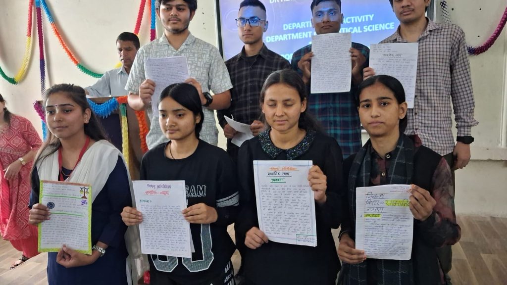 राजकीय स्नातकोत्तर महाविद्यालय में राजनीति विज्ञान क़े तत्त्वधान में विभागीय परिषदीय प्रतियोगिताओं भाषण निबंध पोस्टर तथा काव्य प्रतियोगिताओं का आयोजन