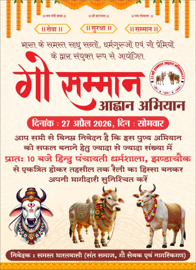 राष्ट्रीय स्तर पर आयोजित गो सम्मान आह्वान अभियान के तहत अभियान को सफल बनाने के लिए एक बैठक का आयोजन किया गया जिसमे आगामी 27 अप्रैल 2026 दिन सोमवार को रैली निकालने का निर्णय लिया गया तथा कार्यक्रम की रूपरेखा तैयार की गई ।